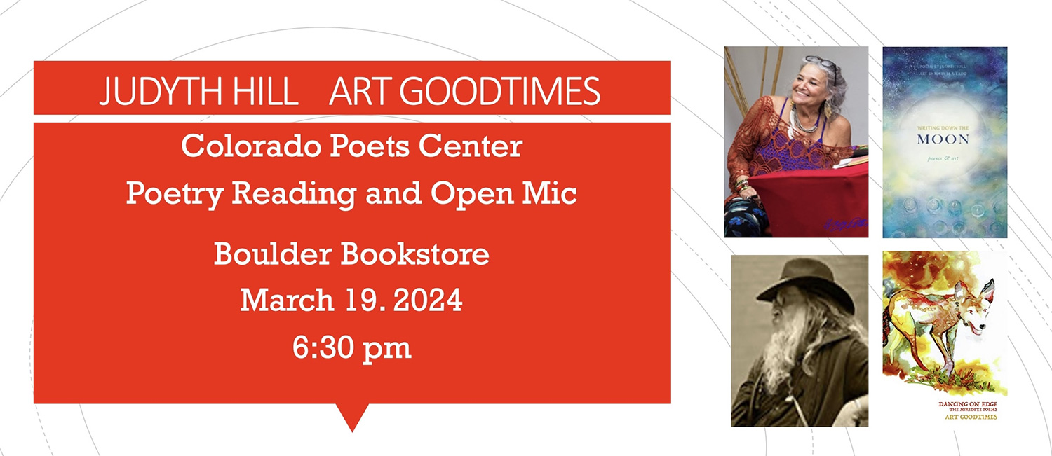 Judyth Hill and Art Goodtimes will be our next poets reading at the Boulder Bookstore  on March 19 at 6:30 pm.