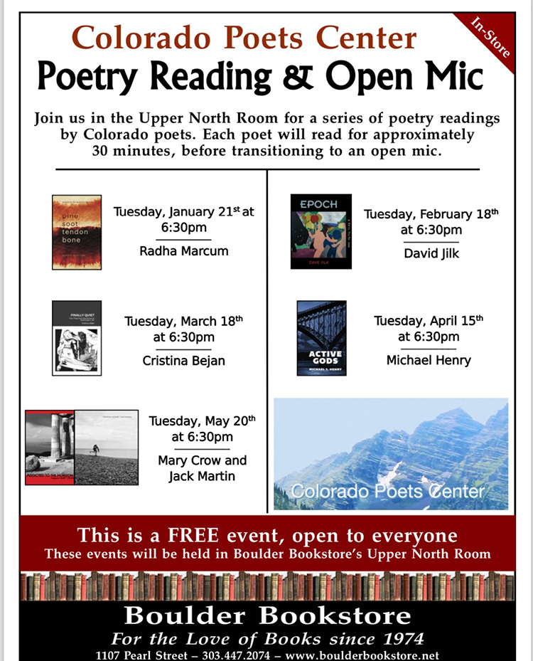 - Your donation of $50 helps us pay one poet to feature in our Tuesday night readings. 40 CPC poets were featured at the Boulder Bookstore or the R Gallery in 2023 and 2024